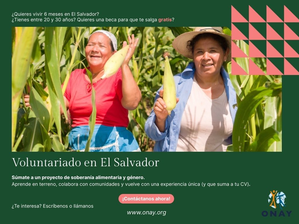 ONAY oferta dos plazas para viajar a El Salvador e intregrase en el equipo de CORDES en un proyecto de Soberanía Alimentaria y Género. Buscamos dos personas, una con un perfil más agrónomo/medioambiental y otra mas social.